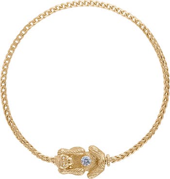 The wise monkey of your choosing shields itself from evil at the center of this 14-karat-gold bracelet featuring a single bezel-set diamond.