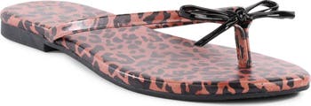 A delicate bow adds a charming touch to the toe post of a leopard-patterned flip-flop featuring an OrthoLite® footbed for premium comfort.