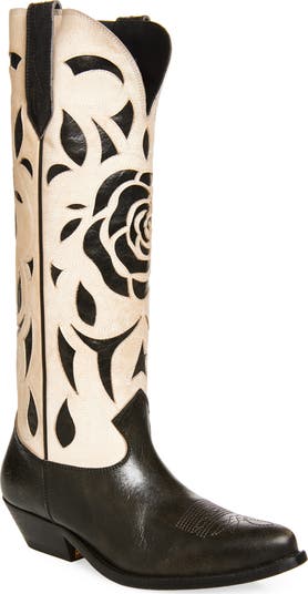 A soaring shaft and a pointy toe perfect the classic Western styling of this handcrafted Italian-leather boot featuring a paneled, colorblocked design with rose topstitching and a stacked, slanted heel.