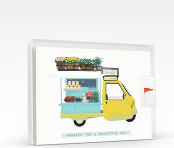 This 8-pack of greeting cards is elegantly illustrated by artist Ingrid Ramus, founder and owner of the Ramus & Co brand. Artwork features "wishing you a beautiful day" truck. All greeting cards are made in the USA on heavyweight uncoated and locally-sourced and manufactured card stock. Each card is accompanied by a hand-embossed envelope made with heavyweight 95lb paper and a peel-and-stick flap - no licking envelopes here! All Ramus & Co. greeting cards are printed on FSC© and SFI© certified paper sourced from a regional mill that harnesses 66% of its energy from on-site sustainable sources, such as emission-free hydroelectricity and biomass co-generation from wood waste. All 8 greeting cards come packaged as a boxed set. Husband-and-wife team Calvin and Ingrid Ramus founded Ramus & Company in 2019, in New England, USA. Ingrid, the creative designer behind the brand, originates from Mexico, where she cultivated her skills in fashion and textile design. Drawing from her unique and inquisitive perspective on preppy style, Ingrid prolifically designs whimsical yet classic stationery and lifestyle items.