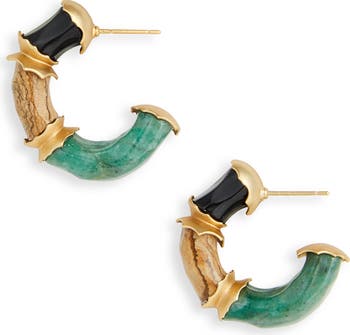 Bamboo-inspired hoop earrings are segmented with green jasper, marbled quartzite and sleek onyx joined by 16-karat gold-plated caps.