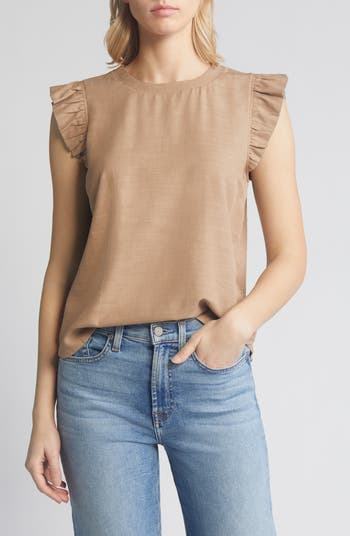Crisp ruffles flutter at the shoulders of this cotton-kissed top designed with an airy keyhole back.