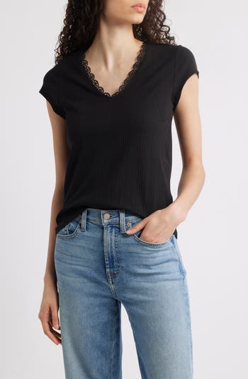 Lilts of lace frame the neckline of an endlessly wearable top crafted in a cotton-enriched blend.