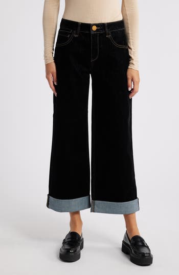 A day-one black wash and golden stitching create a striking look on these ankle-grazing wide-leg jeans made from low-stretch denim.