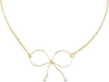 We're tying this fall trend up With A Bow hand wired by our artisans in Honduras and keeping you in fashion! A 1 1/2 inch gold plated bow with white majorca pearls on each end is suspened between gold plated cable chain to create a 16 inch necklace with a lobster clasp and 3 inch extender chain. Complete your look with the matching With a Bow earrings and bracelet.