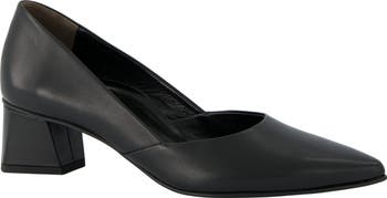 A tapered toe box and architectural block heel create striking dimension on an Italian-made pump fashioned with a pointy toe and set on a cushioned footbed for comfortable wear.