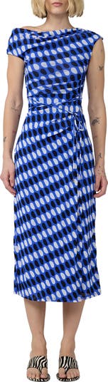 Cut from slinky, stretchy mesh, this one-shoulder midi dress is designed to drape and flatter with artful ruching and gathered details that contour the figure. The hip-hugging silhouette flows into a straight skirt, while a softly draped cowl neckline and single short sleeve add modern asymmetry. An energetic dot print keeps the look playful, and a slender tie at the waist defines the shape.