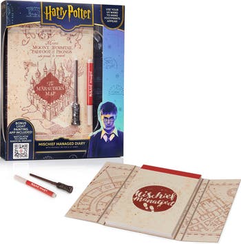 HARRY POTTER: MISCHIEF MANAGED DIARY SET - MARAUDERS MAP NOTEBOOK - I solemnly swear I am up to no good! Immerse yourself in the world of Harry Potter with the Mischief Managed Diary. Whether you wish to document your own magical adventures, create enchanting stories, or simply keep your thoughts safe, this secret diary is perfect. The Marauder's Map is a magical map that revealed all of Hogwarts School of Witchcraft and Wizardry. Now you can do the same by managing your mischief and keeping it a secret with this magical UV reveal diary. Inspired by the Harry Potter and the Prisoner of Azkaban film prop! With this luxurious Marauders Map Diary, you can also write down all of your plans, spells and potion recipes, then close the cover and that’s it...MISCHIEF MANAGED! Using the invisible ink pen, write your secrets, then shine your wands UV tip at the page to reveal what you’ve written! You can even use your wand to make footprints appear! Get ready to go back to school with the only official Mischief Managed Diary with magical UV Harry Potter Wand and pen. Kids and Adults alike will be delighted to receive this beautiful display gift box as the perfect Birthday or Christmas present. WIZARDING WORLD: LICENSED: The Mischief Managed Diary is part of the WOW! Stuff collection of officially licensed merchandise from Warner Bros. INCLUDES: Mischief Managed Diary, Invisible Ink Pen, 4" Harry Potter Mini UV Wand.