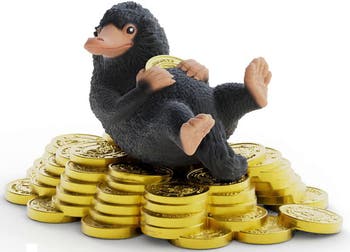 - ADORABLE, MISCHIEVOUS NIFFLER FIGURE: This black-furred, beak-snouted creature is captured mid-roll on a glittering pile of gold, clutching a shiny coin—perfectly showcasing the Niffler’s irresistible love for treasure.