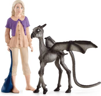 - Luna Lovegood™, is seen here barefoot with her long blonde hair, her purple vest, and her blue bag. The little Thestral stands next to her with its wings spread out.