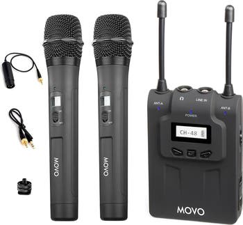 The Movo Wireless Microphone with Integrated Receiver and Two Transmitters is a compact, professional-grade 2.4GHz dual-channel system designed for content creators, vloggers, and mobile filmmakers seeking crystal-clear audio without the hassle of bulky setups. Featuring two clip-on lavalier mics with omnidirectional pickup patterns for versatile voice capture, the system delivers broadcast-quality sound with a low noise floor, 48kHz/24-bit resolution, and up to 656 feet of interference-free transmission range, ensuring reliable performance even in dynamic environments. The integrated receiver mounts seamlessly onto cameras, smartphones, or recorders via a 1/4" headphone jack or 3.5mm TRS output, while the lightweight bodypack transmitters include easy-clip attachments, built-in rechargeable batteries offering 6-8 hours of runtime, and intuitive controls for quick channel pairing and volume adjustment. Compact and durable with a noise reduction algorithm to minimize wind and handling noise, this kit includes windshields, USB-C charging cables, and a carrying case, making it an essential tool for elevating video production quality on the go.