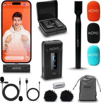 WIRELESS IPHONE MICROPHONE SYSTEM: Capture professional-grade audio directly to your iPhone with an ultralight wireless mic system including a clip-on transmitter with a built-in pro microphone and a compact Lightning receiver for iPhone. WMX-HM HANDHELD ADAPTER: The bundle is completed with a WMX-HM handheld adapter, enabling you to comfortably hold the microphone or attach it to a stand for hands-free use. The WMX-HM also comes with 2 additional windscreens (blue and orange). LONG LASTING BATTERY, LONG RANGE TRANSMISSION: The WMX-2-L system offers a 7-hour battery life with a compact charging case that gives you a full additional charge. Stable 2.4Ghz transmission band and Adaptive Frequency Hopping ensure noise and interference-free transmission at distances up to 328 feet. PORTABLE & DURABLE: The sleek, lightweight design of the microphone and its sturdy carry case make it easy to transport, ensuring it can withstand the rigors of outdoor use. IDEAL STREET INTERVIEW MIC: Engineered specifically for capturing clear and concise audio during street interviews, making it the perfect tool for on-the-go journalists and content creators. DESIGNED IN LOS ANGELES: Movo, carries a full assortment of innovative gear for content creators and proudly supports the content creation community