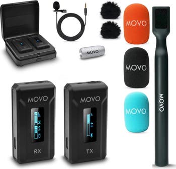Bring professional audio capture to your next interview, vlog, or any content you can imagine with a complete wireless microphone system and versatile handheld mic mount. Weighing just over 1 oz, the WMX-2-TX transmitter easily clips onto clothing and features a built-in studio-grade omnidirectional microphone. Hands-on gain and mute controls help you dial in perfect audio on the fly. The transmitter features a 3.5mm mic/line in jack so that you can use the included lav microphone for even more discreet mic placement.The system operates on a highly-stable 2.4Ghz band. Adaptive Frequency Hopping ensures that your signal will be noise and interference-free at distances up to 328 ft. The receiver features internal HiFi processing, giving you a highly focused and clear sound. A 3.5mm output jack allows you to use the WMX-2 as a microphone for video recording, live applications, and much more.The output is compatible with most DSLR and mirrorless cameras, recorders and more. You'll also have a 3.5mm headphone output so that you can monitor and adjust your audio in real-time. High-visibility 1.25" OLED screens display all your settings. The entire system stores perfectly in a molded hardshell charging case. The system has a 7 hours battery life, and the charging case can hold an additional full charge for recharging on the go. The transmitter and receiver offer a USB-C port for charging individually with the included USB-C charging cable. The Movo WMX-HM features a universally compatible clip attachment head that secures your WMX-2-TX transmitter/lavalier mic. The WMX-HM microphone mount is perfect for interviews, reporting, vlogging and more. It comes with an additional professional grade windscreen that fits over the whole transmitter, allowing you to protect your audio from distortion and noise in any conditions. All Movo products are backed by a 1-year warranty and friendly, US-based customer service.