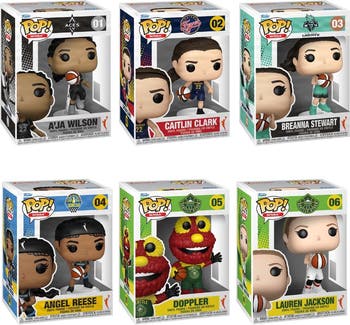 WNBA Funko Pop! Series 1 Complete Set (6). Includes Doppler (Seattle Storm) Mascot, Lauren Jackson (Seattle Storm), A'ja Wilson (Las Vegas Aces), Caitlin Clark (Indiana Fever), Breanna Stewart (New York Liberty) and Angel Reese (Chicago Sky). Each vinyl figure is approximately 3.9 inches and each comes individually packaged in a Funko Pop window display box.
