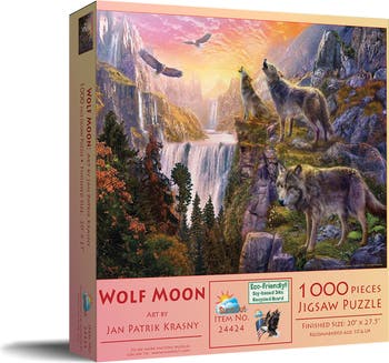 Unleash your passion for puzzles and dive into the enchanting scenery with the Wolf Sun/Wolf Moon 1000 pc Jigsaw Puzzle. Experience the awe-inspiring artwork of renowned artist Jan Patrick Krasny and bring to life a breathtaking scene that transports you into a mystical landscape. Every piece, made from high-quality recycled cardboard and vibrant soy-based inks, is a testament to meticulous craftsmanship and eco-conscious production. This 20" x 27" masterpiece isn't just a hobby; it's a work of art, proudly made in the USA. SunsOut’s commitment to quality and sustainability shines through the advanced interlocking precision of every piece, ensuring a seamless assembly and durability, promising countless hours of engagement. Whether you're a beginner or a seasoned puzzle enthusiast, this puzzle guarantees a smooth and enjoyable experience. Standing as a symbol of the company's exceptional quality and environmental responsibility, SunsOut - a woman-owned small business, provides a worry-free guarantee and superb customer service. This outstanding puzzle serves as the perfect gift for nature enthusiasts and puzzle lovers alike, marrying art, challenge, and sustainability into a thoughtful present that provides an immersive outdoor adventure. Indulge in the joy of puzzling with SunsOut and let the serenity of nature inspire you. Beyond a pastime, this puzzle is a journey of assembly and delight that surpasses expectations.