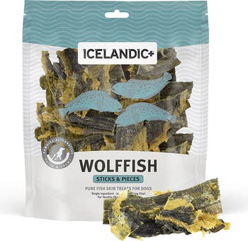 Your dog will love the irresistible taste and toughness of our nutritious, and natural Wolffish Stick & Pieces Fish Skin Chew dog treats, made from one single ingredient— Wolffish Skin. They are caught fresh daily in Iceland's cold, pure waters, and air-dried within FDA, USDA, EU, and MAST standards. Our 100% edible and digestible Wolffish treats promote healthy skin and coat with Omega-3 fatty acids. They also reduce plaque and tartar build-up, making them good for your dog’s teeth. They are perfect for baby teeth to adult teeth transition, too. The Wolffish Skins are very dense, so your pup will really have to work at it to chew on this treat. Plus, since these treats feature a single protein source, they’re a smart choice for dogs with food sensitivities. Get your pet hooked on delicious, healthy Icelandic+ 100% natural, single ingredient fish treats. Ideal for pets with protein sensitivities, our all-natural fish treats are sourced daily from the pure waters of Iceland, and then immediately cleaned, air-dried, and processed. Promoting healthy gums and teeth by reducing tartar and plaque build-up, while also providing Omega-3 fatty acids to help improve your pet’s healthy skin and coat, Icelandic+ fish treats are the treat that will have your pet wagging for more.