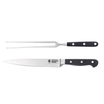 Perfect for slicing uniform portions of large roasts and other cooked meats, the Cuisine::pro® WOLFGANG STARKE Carving set is perfect for carving and serving meats with ease. While the knife’s curved blade profile help to follow contours and guide meat away from the bone, the carving fork is perfect for holding meat in place while slicing and helps to transfer food to plate. The Cuisine::pro® WOLFGANG STARKE™ carving set is as beautifully designed as it is functional.