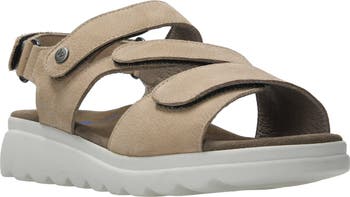 Asymmetric, adjustable vamp straps offer modern intrigue and a secure fit on a cushioned sandal lifted by a subtle platform and wedge heel.