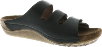 Subtly distressed leather straps enhance the earthy style of this cushioned, comfort-centric sandal.