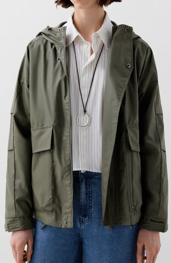 - hood and long sleeves with adjustable velcro cuffs. Patch pockets with flap on hip. Front zip fastening concealed by placket with press studs.
