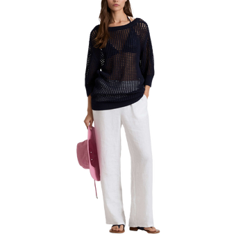 Crafted in organic cotton and linen crochet, this sweater is a softly structured layer for breezy evenings. Wear it with the boat neck or reversed for a wider neckline across the collarbones