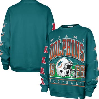 Stay cozy while showing off your team pride in this Miami Dolphins Go Big Oversized Pullover Sweatshirt from '47. The oversized fit provides a comfortable and relaxed feel, perfect for layering or lounging. The screen print team graphics with glitter details add a touch of sparkle and team pride, making this sweatshirt a standout piece in your Miami Dolphins collection.