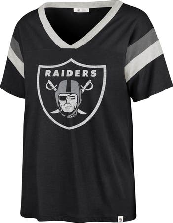 The Women's '47 Black Las Vegas Raiders Phoenix V-Neck T-Shirt is the perfect way to show your support for the Las Vegas Raiders. With its distressed graphics for a vintage look, screen print graphics, and sewn-in sleeve stripes, this shirt is sure to turn heads. The front yoke seam adds a touch of style, while the cotton material ensures comfort all day long. Whether you're cheering on the Raiders at the stadium or just relaxing at home, this shirt is a must-have for any fan.