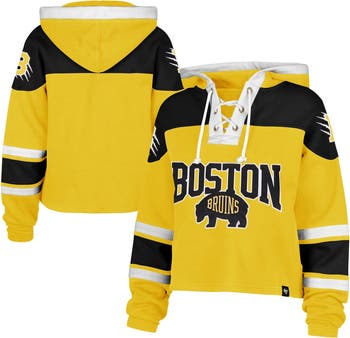 Step up your style game and celebrate the excitement of the 2026 NHL Stadium Series with the '47 Boston Bruins Cropped Lacer Hoodie, designed with a trendy cropped hem hitting right above the hip and an adjustable lace-up neckline for a customizable fit. Ideal for moderate temperatures, this midweight layer captures the energy of the outdoor matchup with embroidered fabric applique team graphics and sewn-on stripes, seamlessly blending fashion-forward design with authentic Boston Bruins fandom for a look that stands out long after the final whistle.