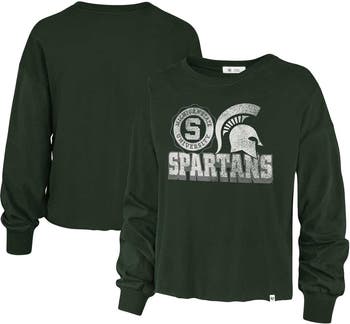 The Women's '47 Green Michigan State Spartans Bottom Line Parkway Long Sleeve High Waist T-Shirt is the perfect way to show your support for the Spartans. With its rib-knit collar and cuffs, distressed details for a vintage look, and unfinished hem with brand clip tag, this shirt is both stylish and comfortable. The cropped length that hits at the waist is perfect for a casual day out or a game day. Made from 100% cotton, this shirt is soft and breathable, making it perfect for any occasion.