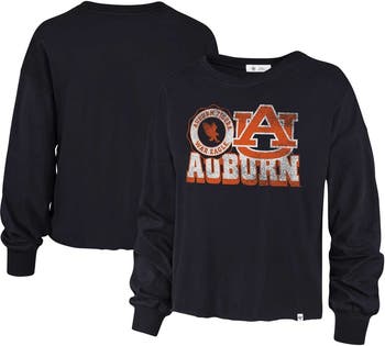 The Women's '47 Navy Auburn Tigers Bottom Line Parkway Long Sleeve High Waist T-Shirt is the perfect way to show your Auburn Tigers pride. This stylish tee features a rib-knit collar and cuffs, distressed details for a vintage look, and an unfinished hem with a brand clip tag. The cropped length hits at the waist, making it perfect for pairing with your favorite jeans or shorts. Made from soft cotton, this tee is comfortable to wear all day long. Whether you're cheering on the Tigers at the game or just showing your support around town, this tee is sure to turn heads.