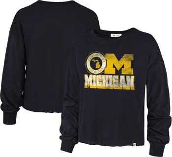 The Women's '47 Navy Michigan Wolverines Bottom Line Parkway Long Sleeve High Waist T-Shirt is the perfect way to show your support for the Michigan Wolverines. This stylish tee features a rib-knit collar and cuffs, distressed details for a vintage look, and an unfinished hem with a brand clip tag. The cropped length hits at the waist, making it perfect for pairing with your favorite jeans or leggings. Made from soft cotton, this tee is comfortable to wear all day long.