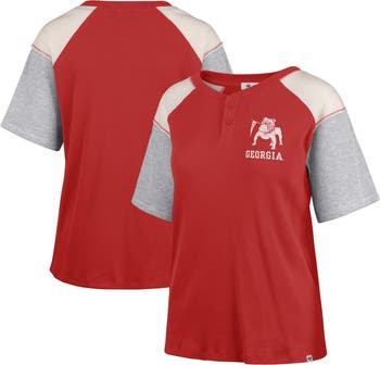 The Women's '47 Red Georgia Bulldogs Underline Harvey Colorblock Raglan Henley T-shirt is the perfect way to show support for the Georgia Bulldogs. With screen-printed graphics and a two-button placket, this shirt is stylish and comfortable. Ribbed material and raglan sleeves add a sporty touch, while the Georgia Bulldogs logo proudly displays team spirit. Whether cheering at the game or showing support around town, this shirt is sure to turn heads.