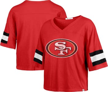 This '47 San Francisco 49ers Double Header Scout Cropped V-Neck T-Shirt adds a stylish twist to your game day wardrobe. This tremendous tee features a distressed San Francisco 49ers logo printed across the chest, showcasing your fandom with vintage charm. The cropped hem adds a modern touch, making it perfect for pairing with high-waisted jeans or shorts for a game day look that's both spirited and on-trend.