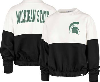 The Women's '47 White/Black Michigan State Spartans Take Two Bonita Pullover Sweatshirt is the perfect way to show your support for the Michigan State Spartans. Made from a comfortable cotton and polyester blend, this midweight sweatshirt is perfect for moderate temperatures. The elastic waist hem ensures a snug fit, while the distressed details give it a vintage look. Whether you're cheering on the Spartans at the game or just relaxing at home, this sweatshirt is sure to keep you comfortable and stylish.