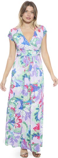 Elevate your wardrobe in this 24seven Comfort Apparel lilac abstract print V neck maxi dress, where playful charm meets effortless elegance. Designed with a long, floor length A line silhouette with a side slit and cap sleeves, it flatters your shape while offering graceful movement. Crafted from a soft, lightweight polyester blend, it ensures comfort from day to night. Pair it with heels and silver jewelry for a polished look, and enjoy easy machine washable care.