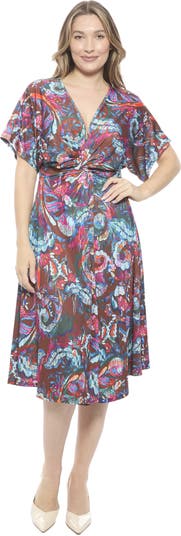 Womens Abstract V-Neck Short Dolman Sleeve Twist Front A-Line Midi Dress