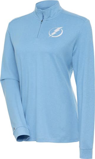 The Women's Antigua Light Blue Tampa Bay Lightning White Logo Mentor Quarter-Zip Jacket is the perfect way to show your support for the Tampa Bay Lightning. Made of comfortable polyester and spandex, this jacket features embroidered graphics and a mock neck to keep you warm and stylish on game day. The covered zipper placket adds a touch of sophistication, while the Tampa Bay Lightning logo proudly displays your team spirit. Whether you're cheering from the stands or just hanging out at home, this jacket is sure to become a favorite.