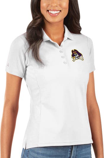 Embrace the legacy of the ECU Pirates with the Women's Antigua White ECU Pirates Legacy Pique Polo. This stylish polo features embroidered graphics that proudly display your unwavering support for the Pirates. Its comfortable polyester fabric and moisture-wicking technology ensure you stay cool and dry, whether you're cheering from the stands or representing your team off the field. The five-button placket and flat knit collar add a touch of sophistication, while the princess and underarm seams provide a flattering fit. Show your Pirate pride with this timeless polo that embodies the spirit of the ECU Pirates.