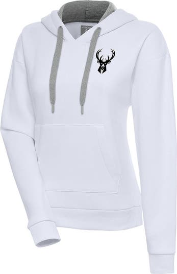 Women's Antigua White Milwaukee Bucks Brushed Metallic Victory Pullover Hoodie