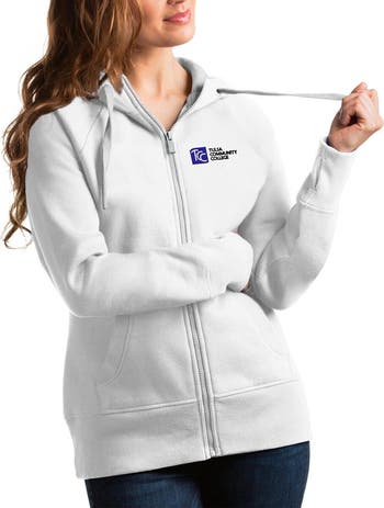 Represent your Tulsa Community College pride with the Antigua White Tulsa Community College Victory Full-Zip Hoodie. This midweight hoodie features embroidered graphics and a full-zip closure, perfect for moderate temperatures. The jersey face fleece-back material provides warmth and comfort, while the raglan sleeves and thumbholes at the cut-and-sew cuffs offer a comfortable fit. Show your support for Tulsa Community College with this stylish and functional hoodie.