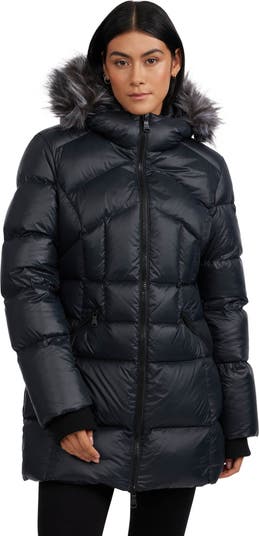 Discover the perfect balance of style and functionality in this mixed-quilt puffer with a fixed hood and detachable fake fur trim. Equipped with cozy rib knit storm cuffs and a fixed bib, this jacket provides a secure fit while repelling water and wind penetration through a shiny cire coating finish. Experience warmth up to -20 degree C/-4 degree F with the four-layer construction and duck down.