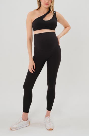 - High-rise maternity waistband for gentle belly support. 26" inseam. No front seam for a smooth fit. Seam designed to sit above c-section areas. V-shaped back seam with scrunch detail for enhanced shaping and lift. Buttery-soft second-skin fabric. 75% Nylon, 25% Spandex. Machine wash cold with like colors. Do not bleach. Tumble dry low & remove promptly. Do not iron, do not dry clean.