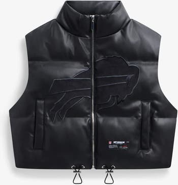 Off Season continues to redefine fan apparel with high-end designs that will take any outfit to new heights. This heavyweight Buffalo Bills cropped puffer vest from the Off Season x NFL collection is crafted from smooth faux leather, ensuring you have an MVP-worthy fit for game day. Designed with a cropped hem and an adjustable bungee waistband for a custom fit, it delivers a fashion-forward silhouette that pairs effortlessly with any look. Finished with a funnel-neck collar with embroidered team detailing and a tonal corduroy logo at the front, this piece elevates your style and team spirit with subtle elegance.