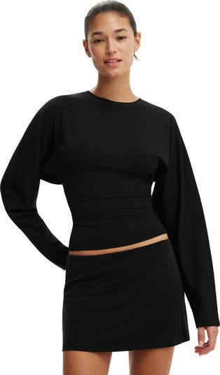 Featuring a chic batwing long sleeve top with clinched waist, this tee strikes the perfect balance between playful and elegant