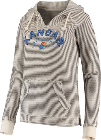 The Women's Blue 84 Cream Kansas Jayhawks Striped French Terry V-Neck Pullover Hoodie is the perfect way to show your support for the Kansas Jayhawks. Made from a soft and comfortable cotton and polyester blend, this hoodie features a stylish striped design and a flattering V-neck. The front pouch pocket is perfect for storing your essentials, and the hood with drawstring will keep you warm on chilly days. Whether you're cheering on the Jayhawks at the game or just relaxing at home, this hoodie is sure to become a favorite.
