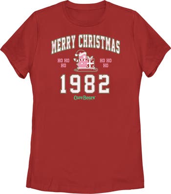 - Strut your stuff with this stylish new Christmas women's t-shirt that is perfect for the holidays! Featuring Cheer Bear on a sled alongside the text: "Ho Ho Ho Merry Christmas 1982" printed in distressed varsity font.