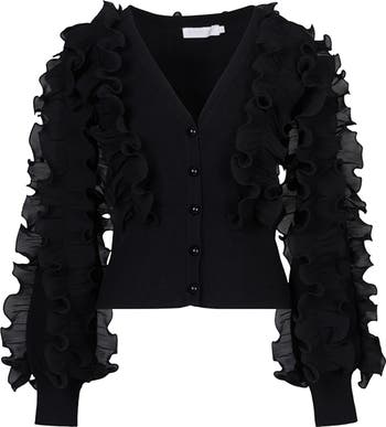 - Model is 178 cm/ 5'10" and is wearing a size 38 Fitted cardigan with V-neckline Button down 80% Viscose, 20% Polyamide; Ruffles: 100% Polyester Made of a viscose blend knit and top stitched pleated ruffles. Viscose has a silky matte luster with an elegant drape. This drape is supple and has a softness that is comfortable to wear Follow care instructions on garment Anne Fontaine Essentials Collection
