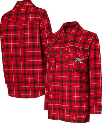 The Women's College Concepts Red/Black Chicago Bulls Boyfriend Button-Up Nightshirt is the perfect way to show your love for the Chicago Bulls. This nightshirt features embroidered graphics, a woven plaid pattern, two chest pockets with flaps, one-button cuffs, two front slip pockets, and a rounded droptail hem. Made from a soft cotton and polyester blend, this nightshirt is comfortable and stylish, perfect for any Bulls fan.