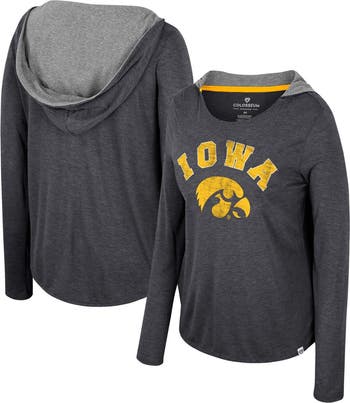 The Women's Colosseum Black Iowa Hawkeyes Distressed Heather Long Sleeve Hoodie T-Shirt is the perfect way to show your support for the Iowa Hawkeyes. Made from a soft and comfortable polyester and rayon blend, this hoodie features a scoop neck, rounded hem, and distressed screen print graphics that give it a vintage look. Whether you're cheering on the Hawkeyes at the game or just relaxing at home, this hoodie is sure to keep you warm and stylish.
