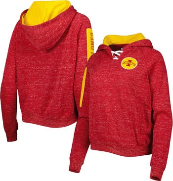 The Women's Colosseum Cardinal Iowa State Cyclones The Devil Speckle Lace-Placket Raglan Pullover Hoodie is the perfect way to show your support for the Iowa State Cyclones. This midweight hoodie features a faux lace-up neckline, fleece lining, and front pouch pocket, making it perfect for chilly game days. The embroidered fabric applique and fabric applique with distressed screen print graphics proudly display your Iowa State Cyclones pride. Whether you're cheering from the stands or simply showing your support, this hoodie is the perfect way to represent the Iowa State Cyclones in style.